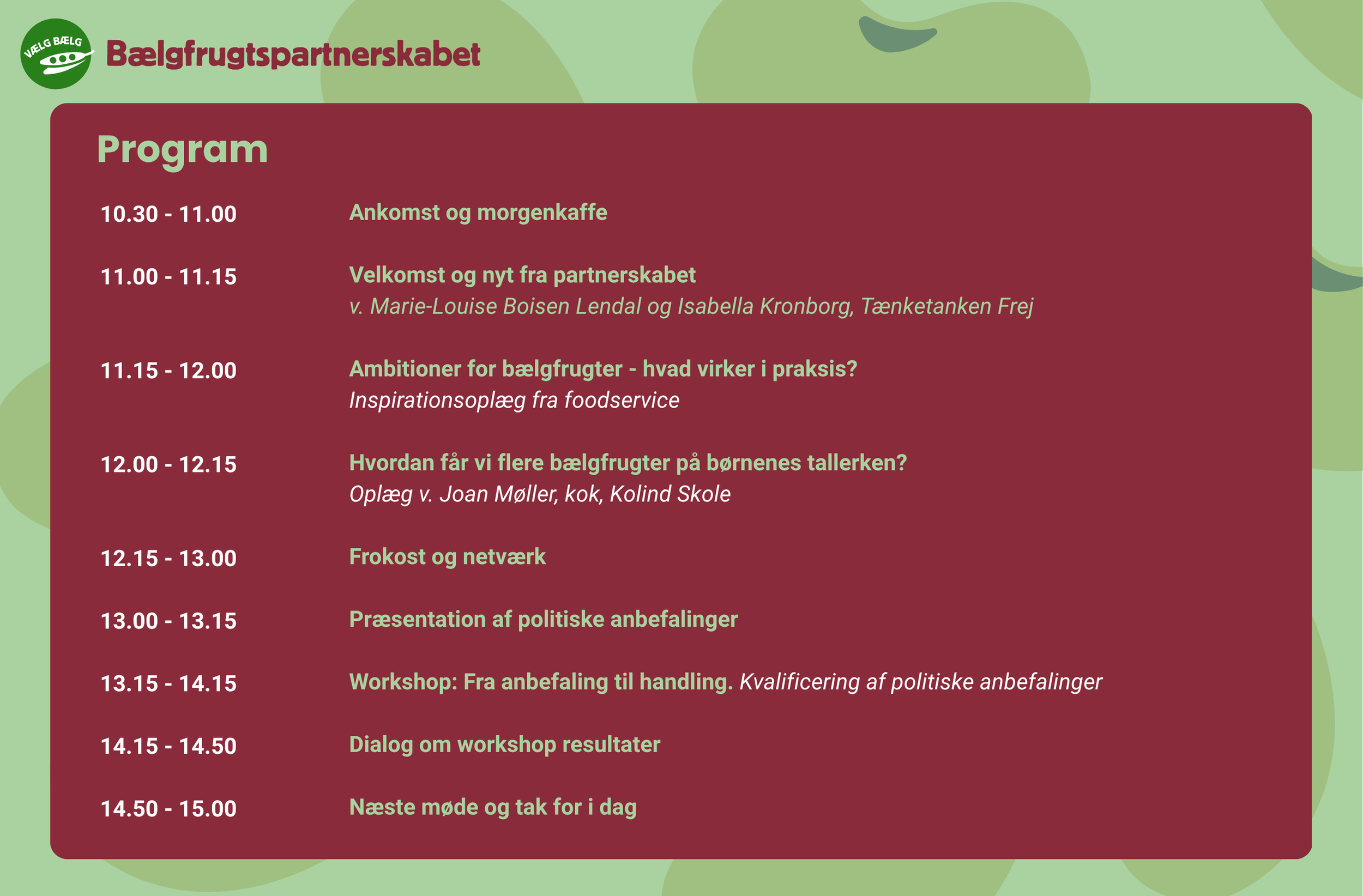 Samtidig står partnerskabet et vigtigt sted. Vi arbejder med at udvikle politiske anbefalinger for Bælgfrugtspartnerskabet, og på mødet inviterer vi jer med ind i processen. Erfaringer og perspektiver fra hele værdikæden er afgørende for, at anbefalingerne bliver både ambitiøse og realistiske.